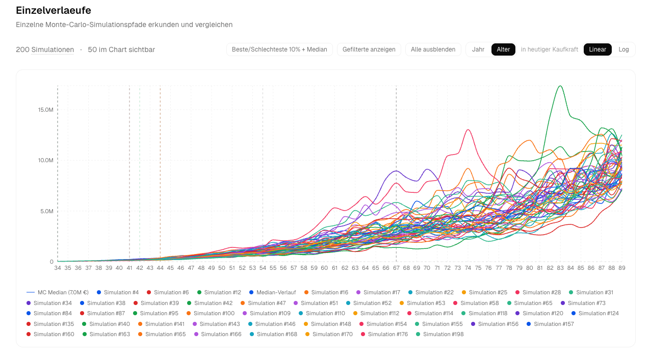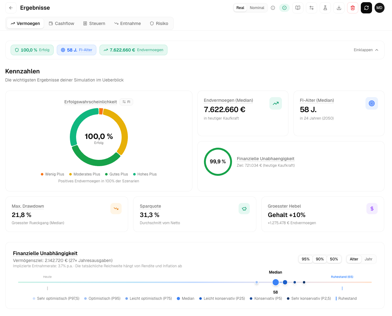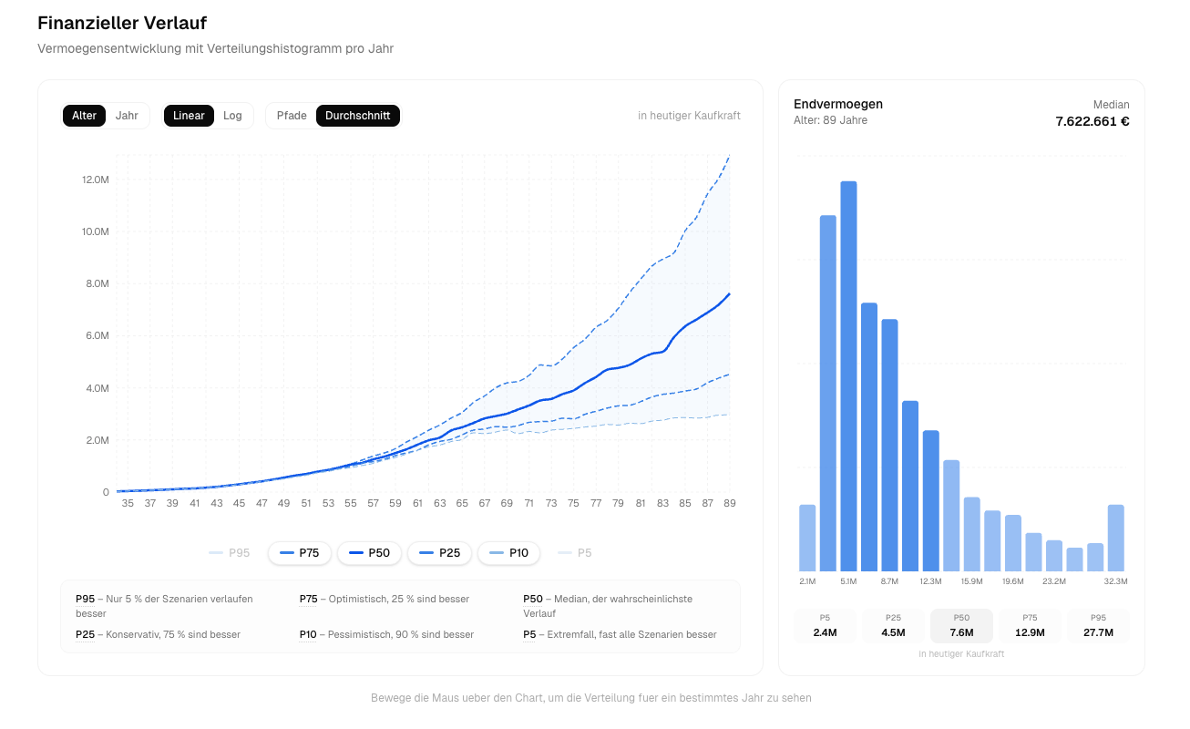 Dein Finanzplan wird nicht von einer Formel berechnet, sondern von einer Monte-Carlo-Simulation durchgespielt — mit Inflation, Steuern und echten Marktdaten.