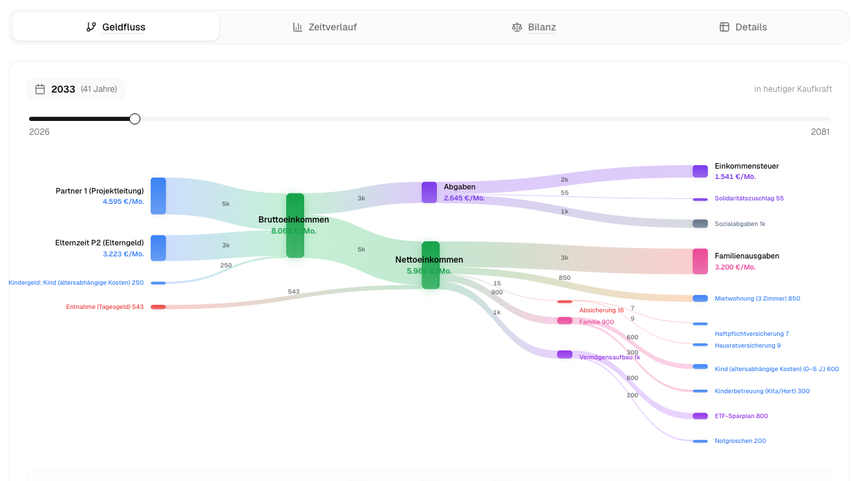 Jobwechsel, Elternzeit, Immobilienkauf, ETF-Sparplan — jede Entscheidung verändert alles. Wir bilden sie alle ab.